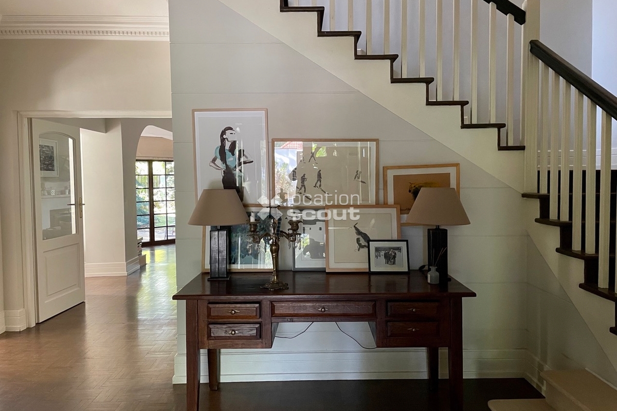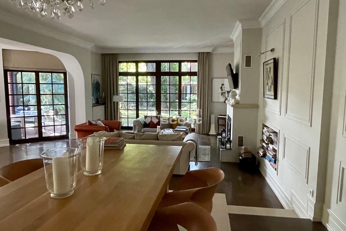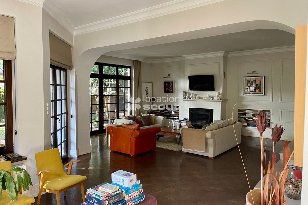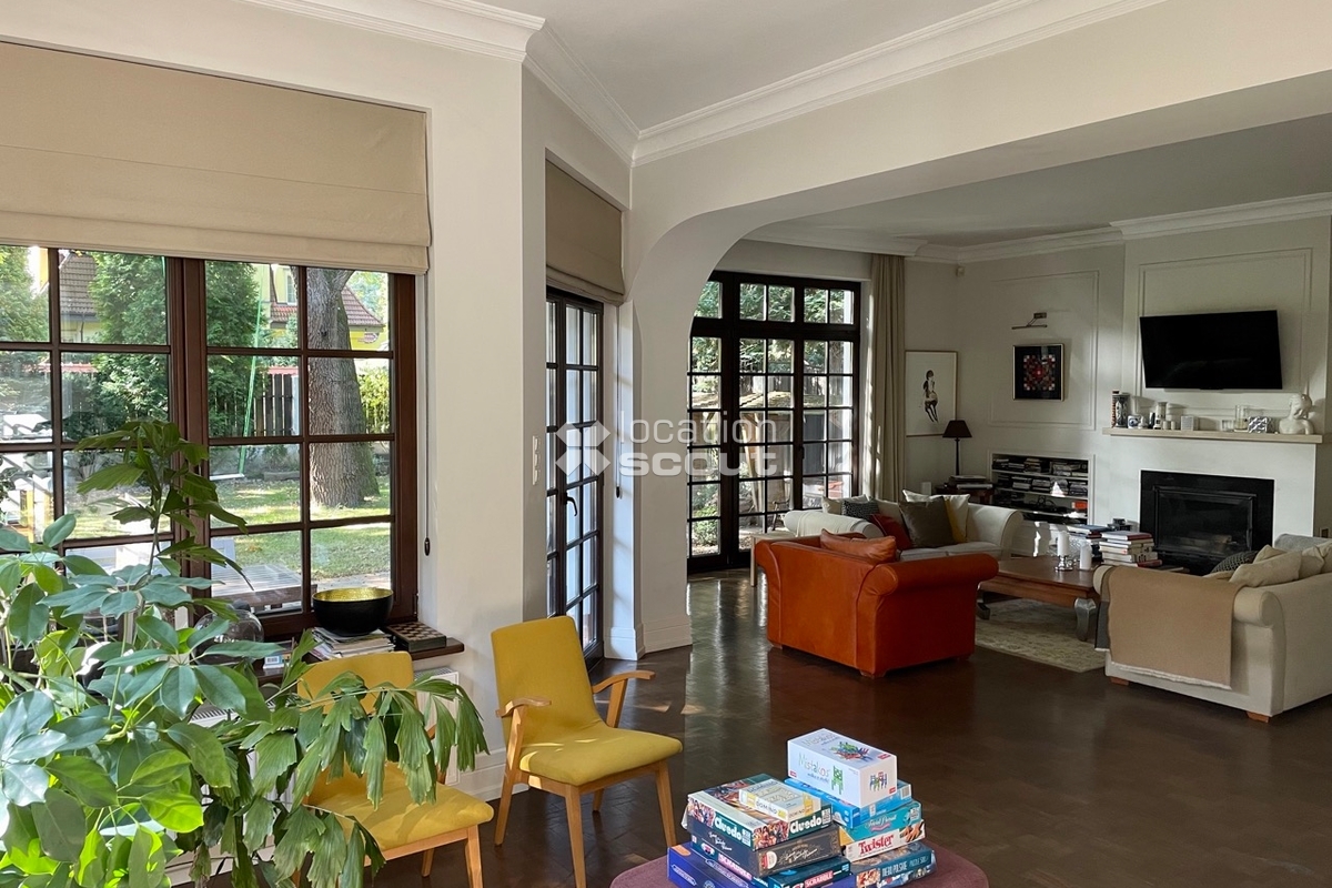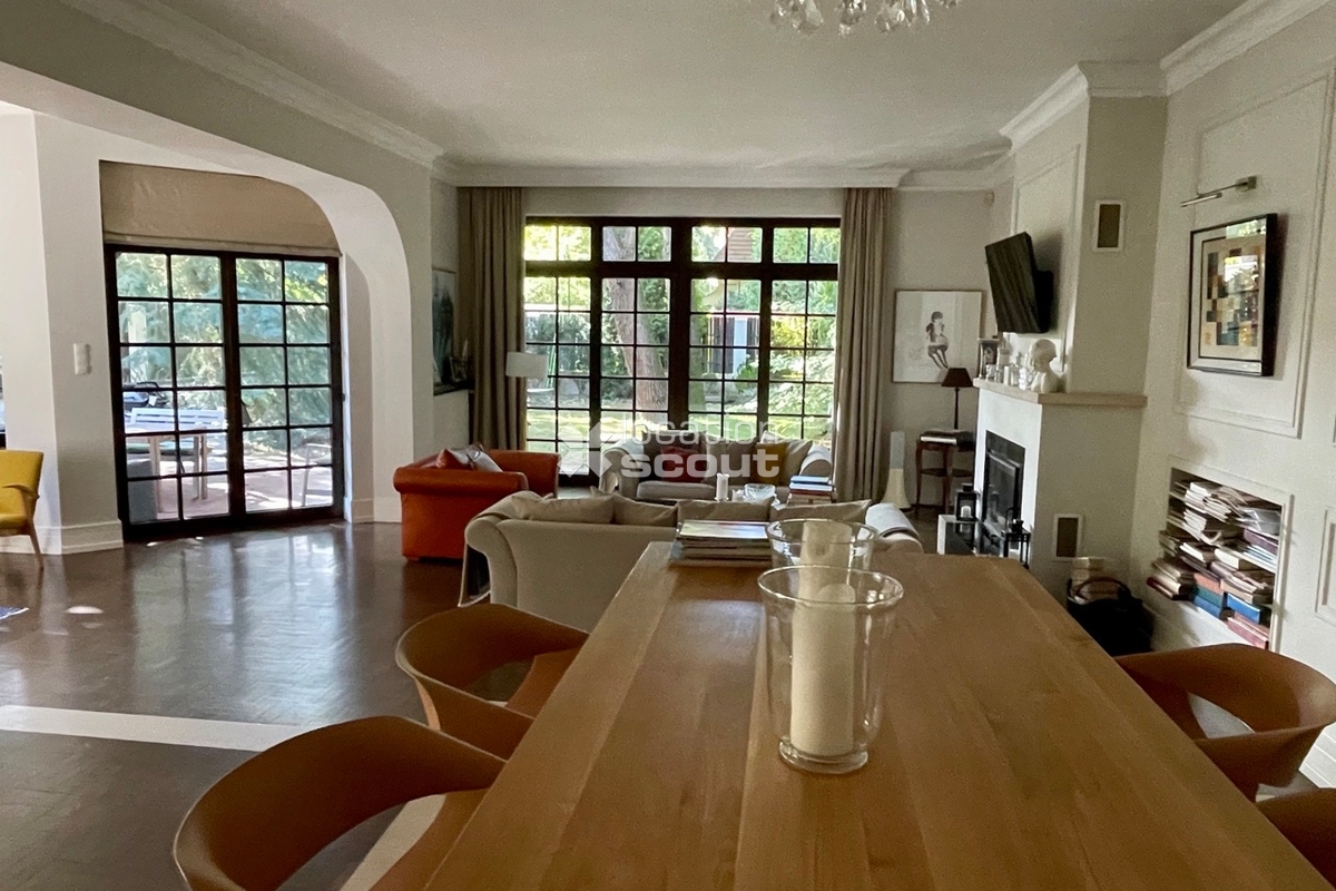 Rezydencja na obrzeżach Warszawy w stylu anglosaskim. Salon połączony z jadalnią, przestronny hol wejściowy.