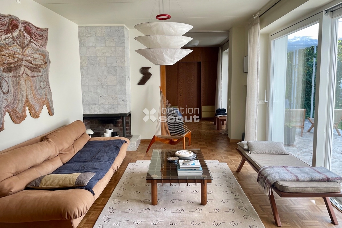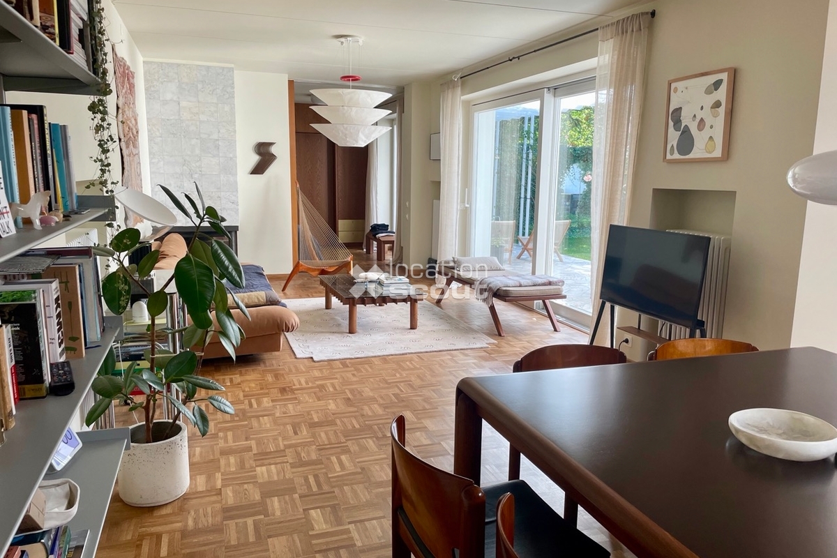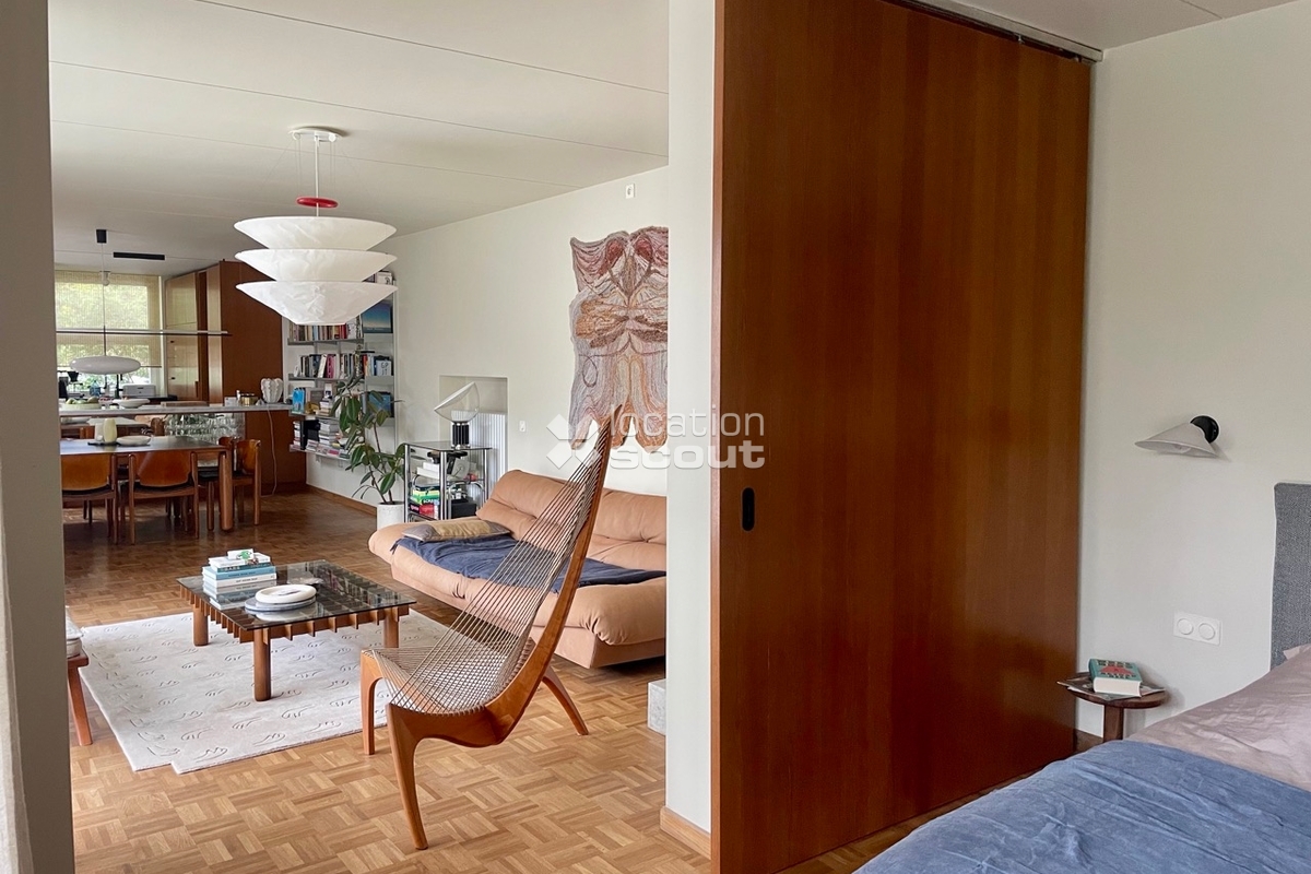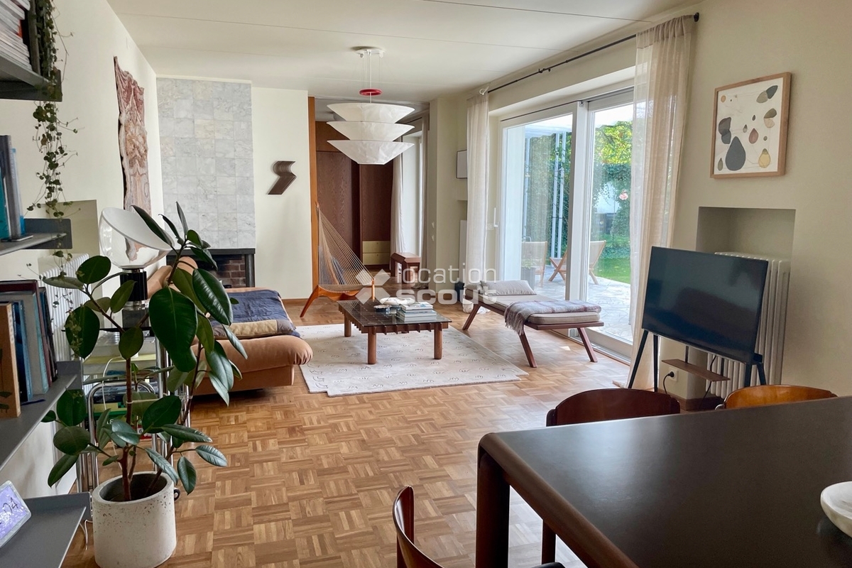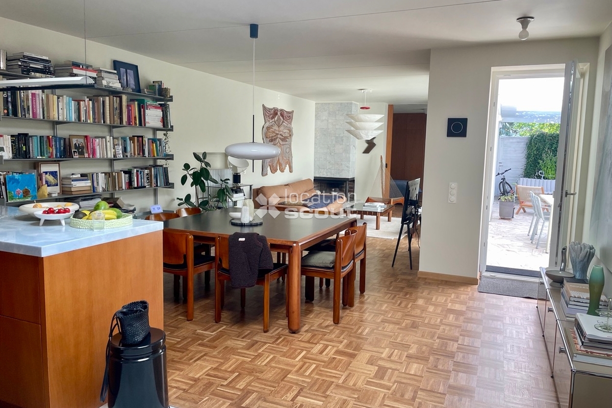 Parterowy dom w zabudowie szeregowej w stylu mid-century modern.