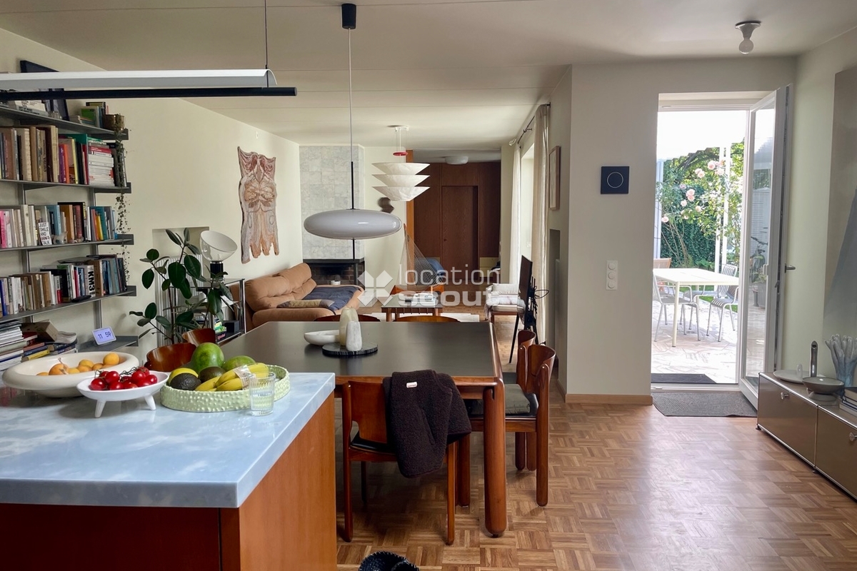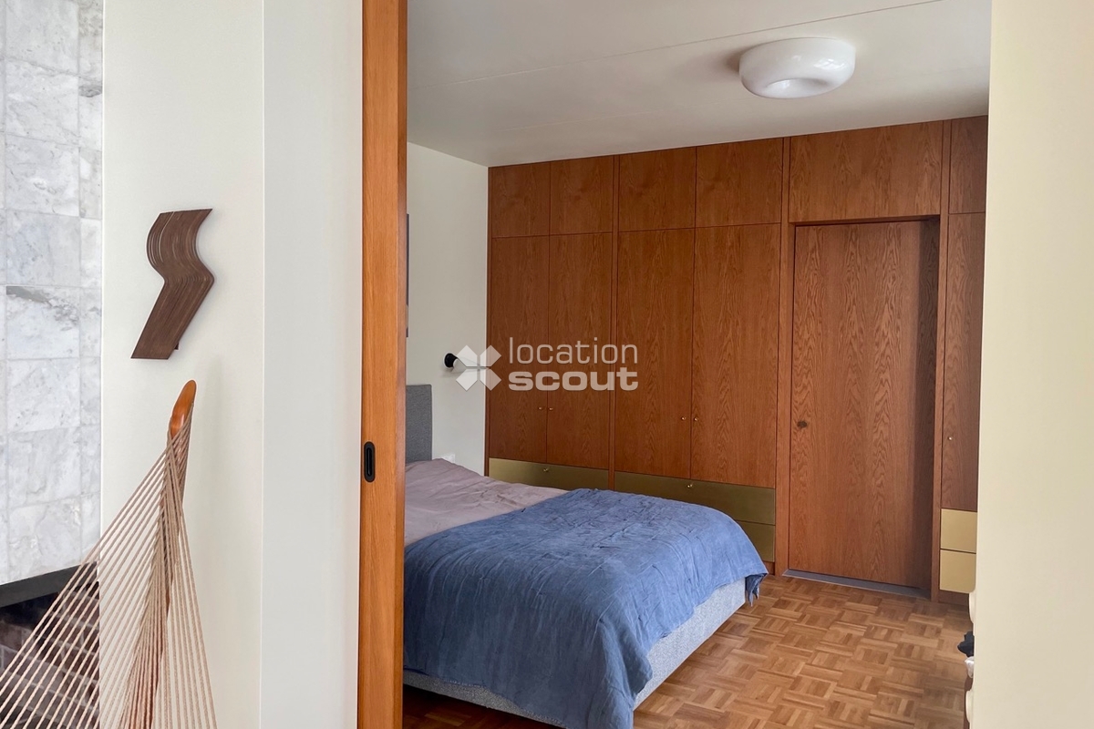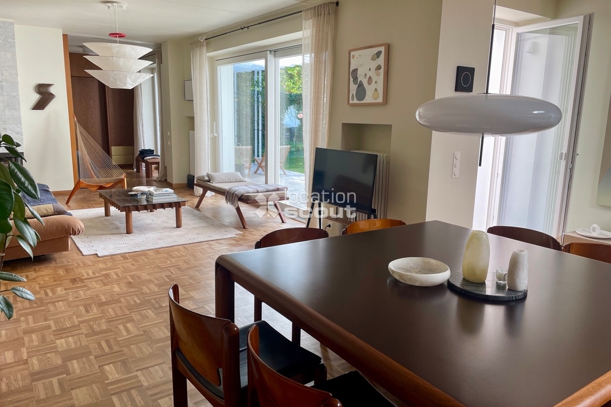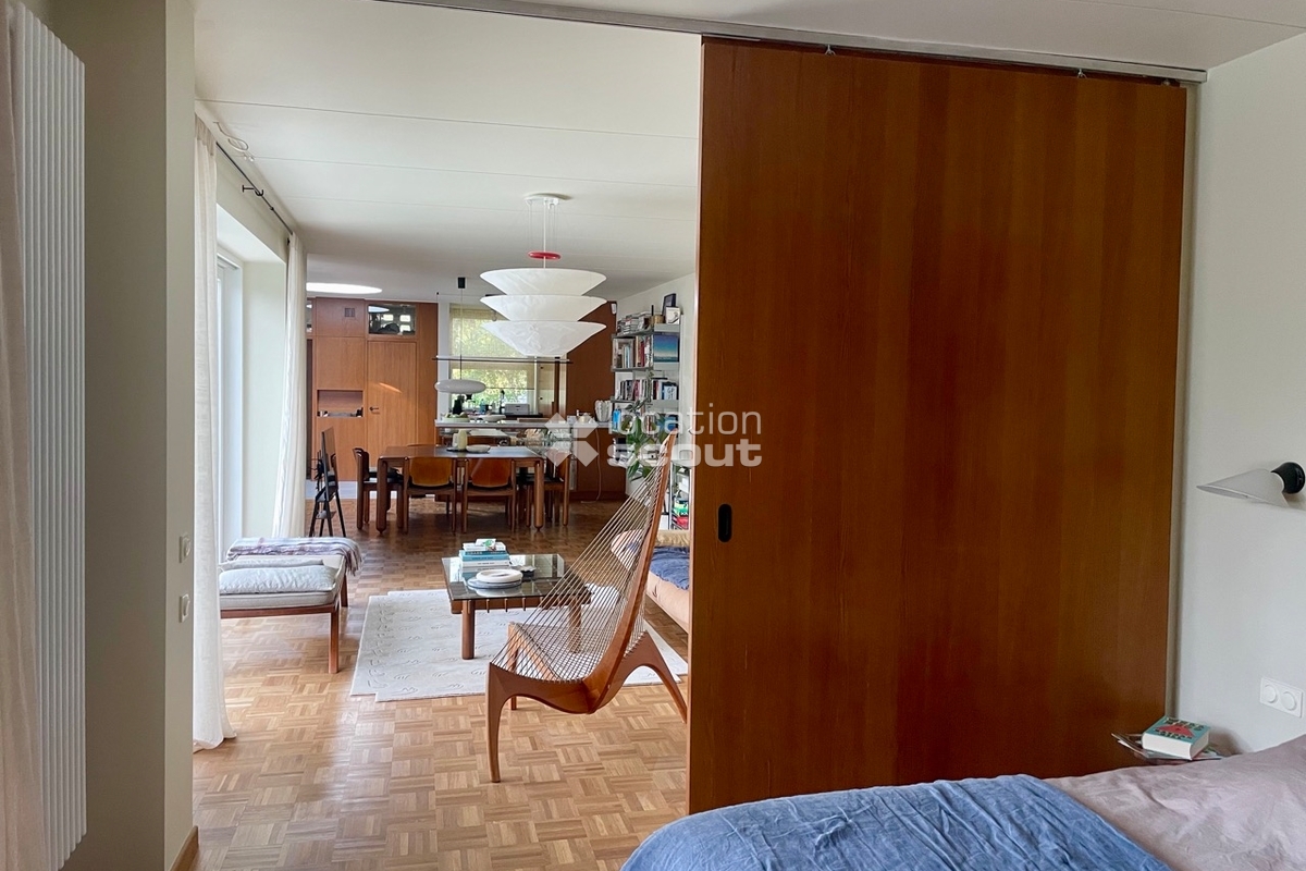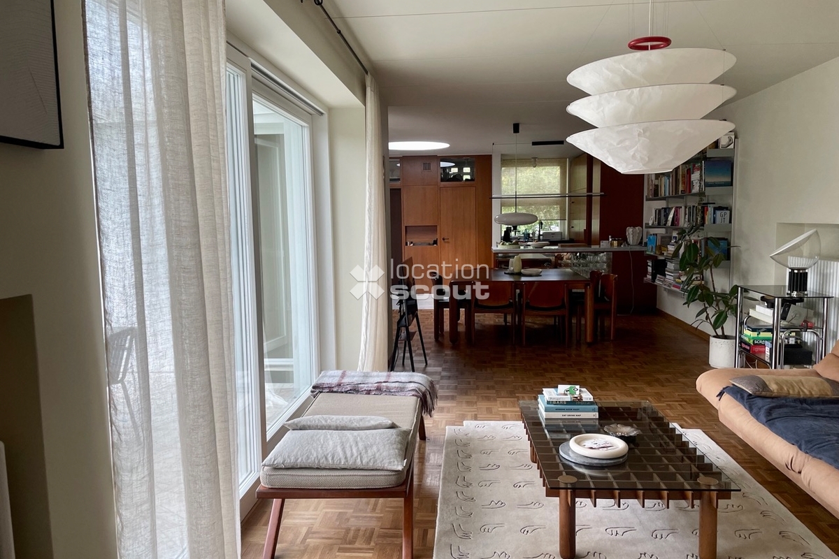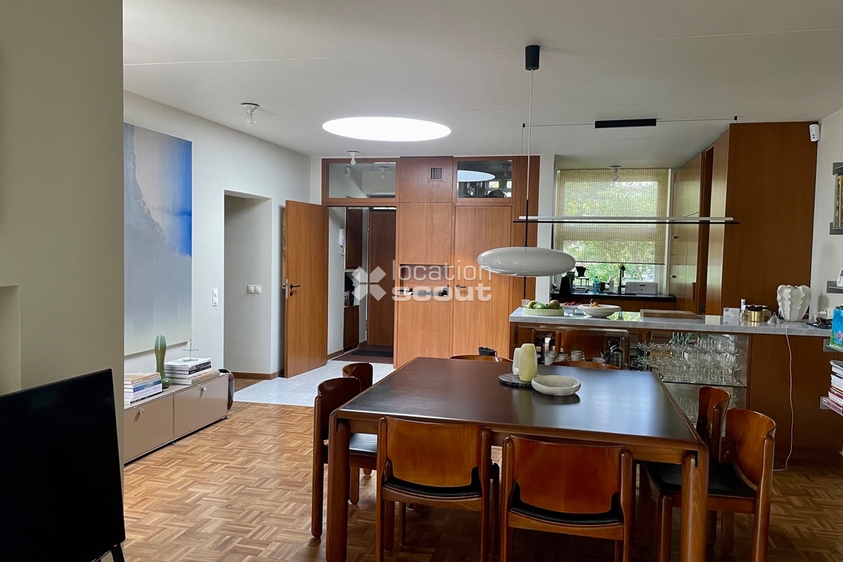 Parterowy dom w zabudowie szeregowej w stylu mid-century modern.